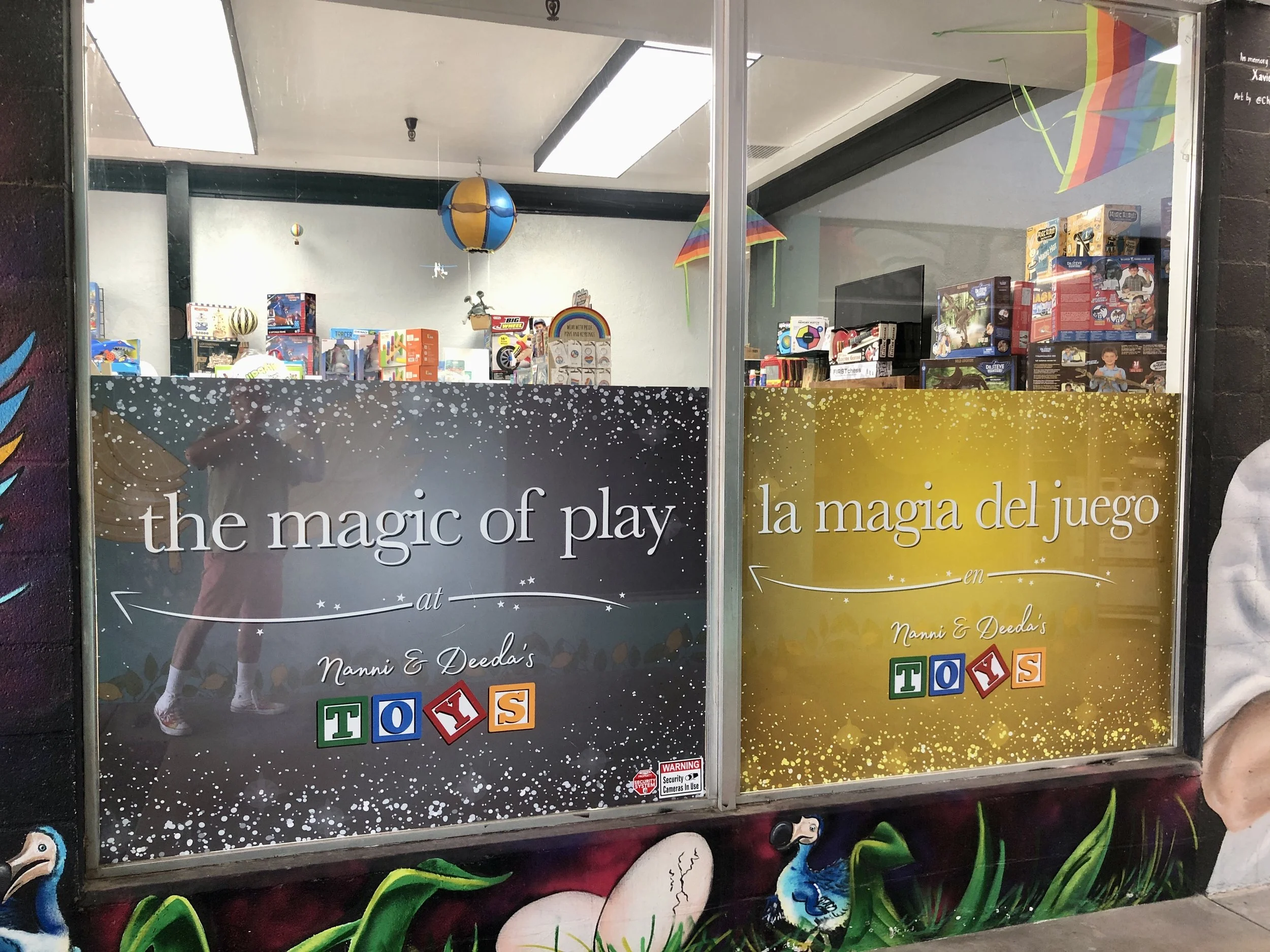 Logo design, uniform tees, window treatments and marketing promos for Nanni & Deeda’s Toys, the best little toy store in California.